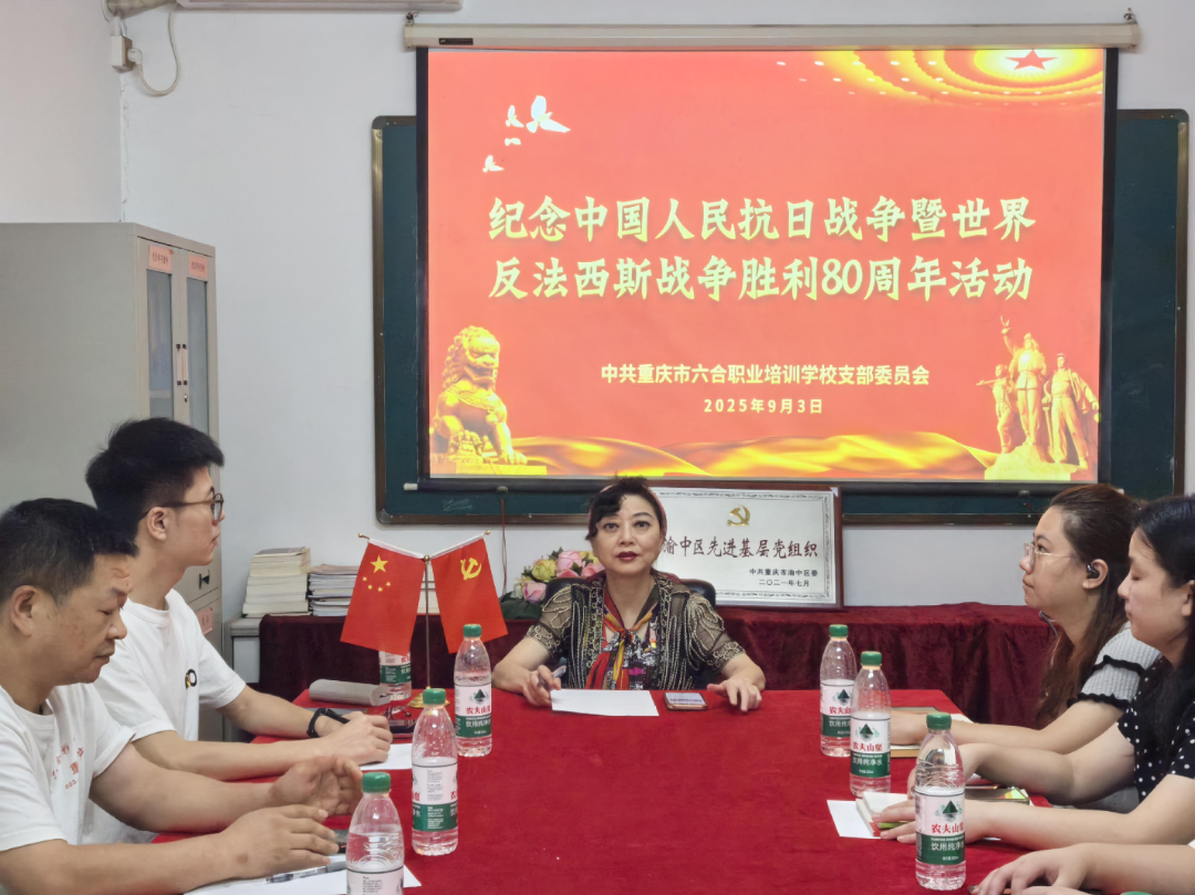2025年9月3日上午9点整,六合学校党支部于六合学校一校区党员活动室精心组织了一场意义非凡的纪念活动,参与人员涵盖党员同志、预备党员、教职员工代表及师生代表,共同缅怀中国人民抗日战争暨世界反法西斯战争胜利80周年这一伟大时刻。活动由何林惠同志主持。